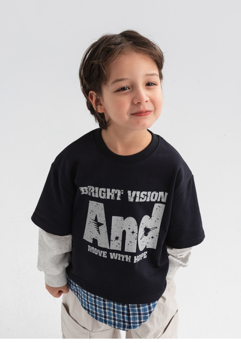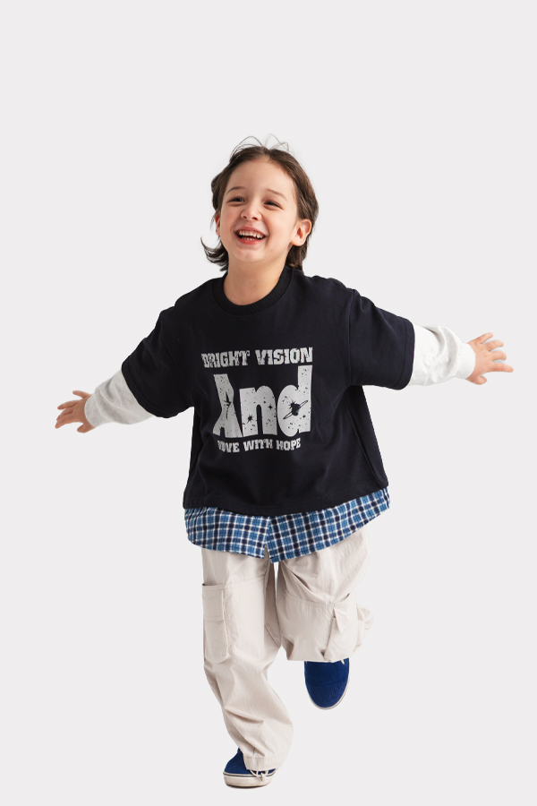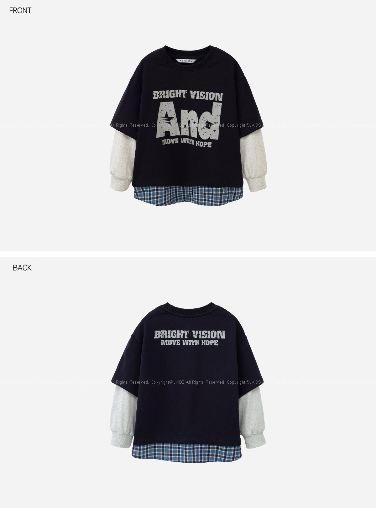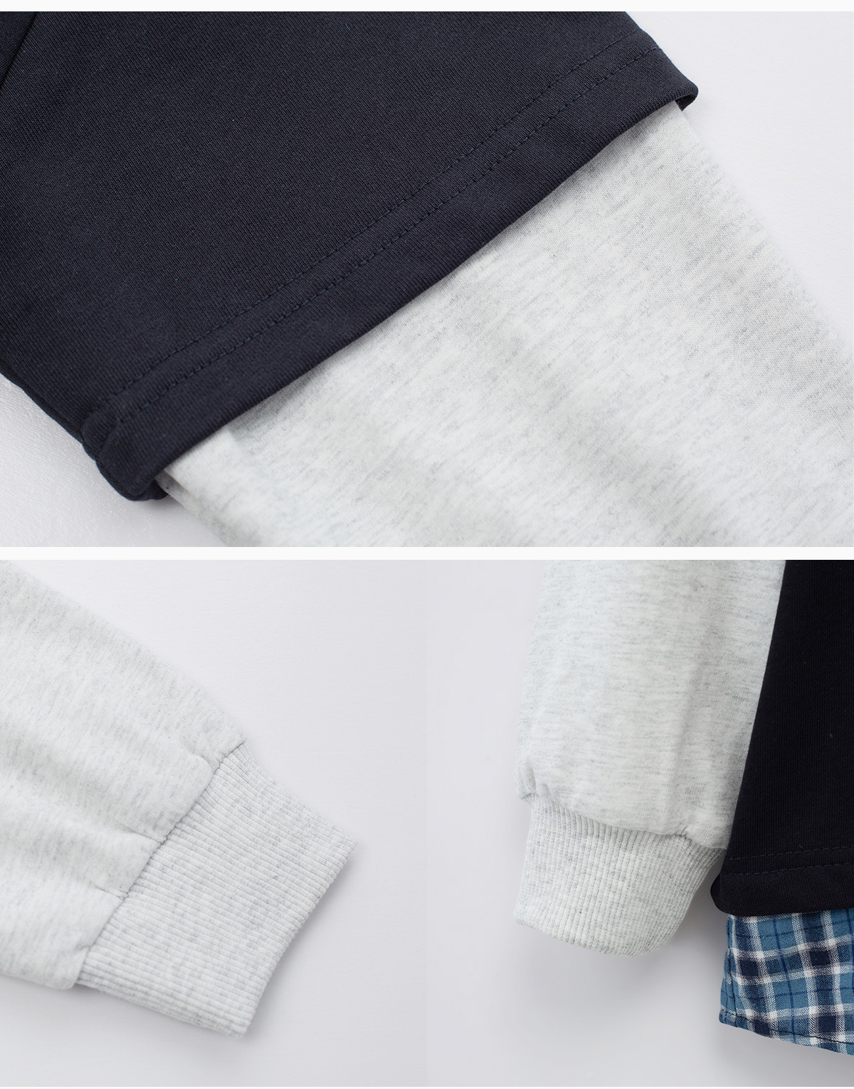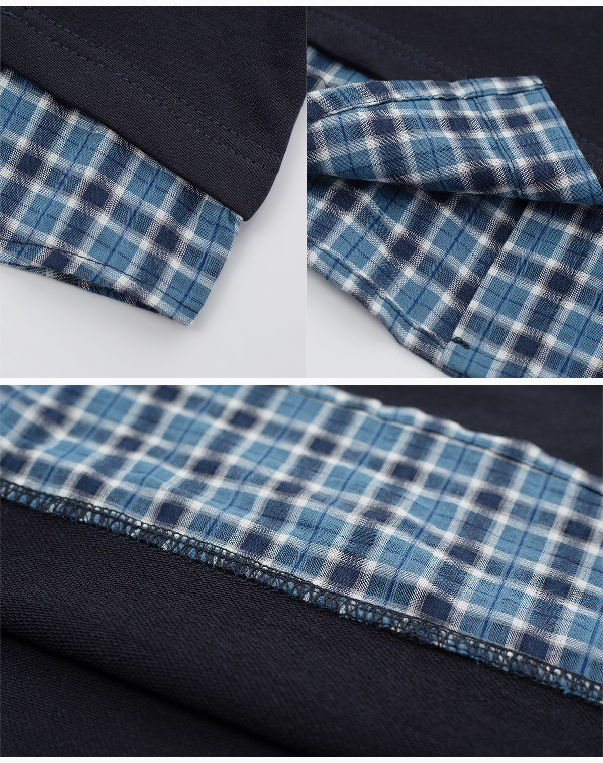 체크 셔츠와 반팔 티를 함께 매치한 듯한 디테일로,
