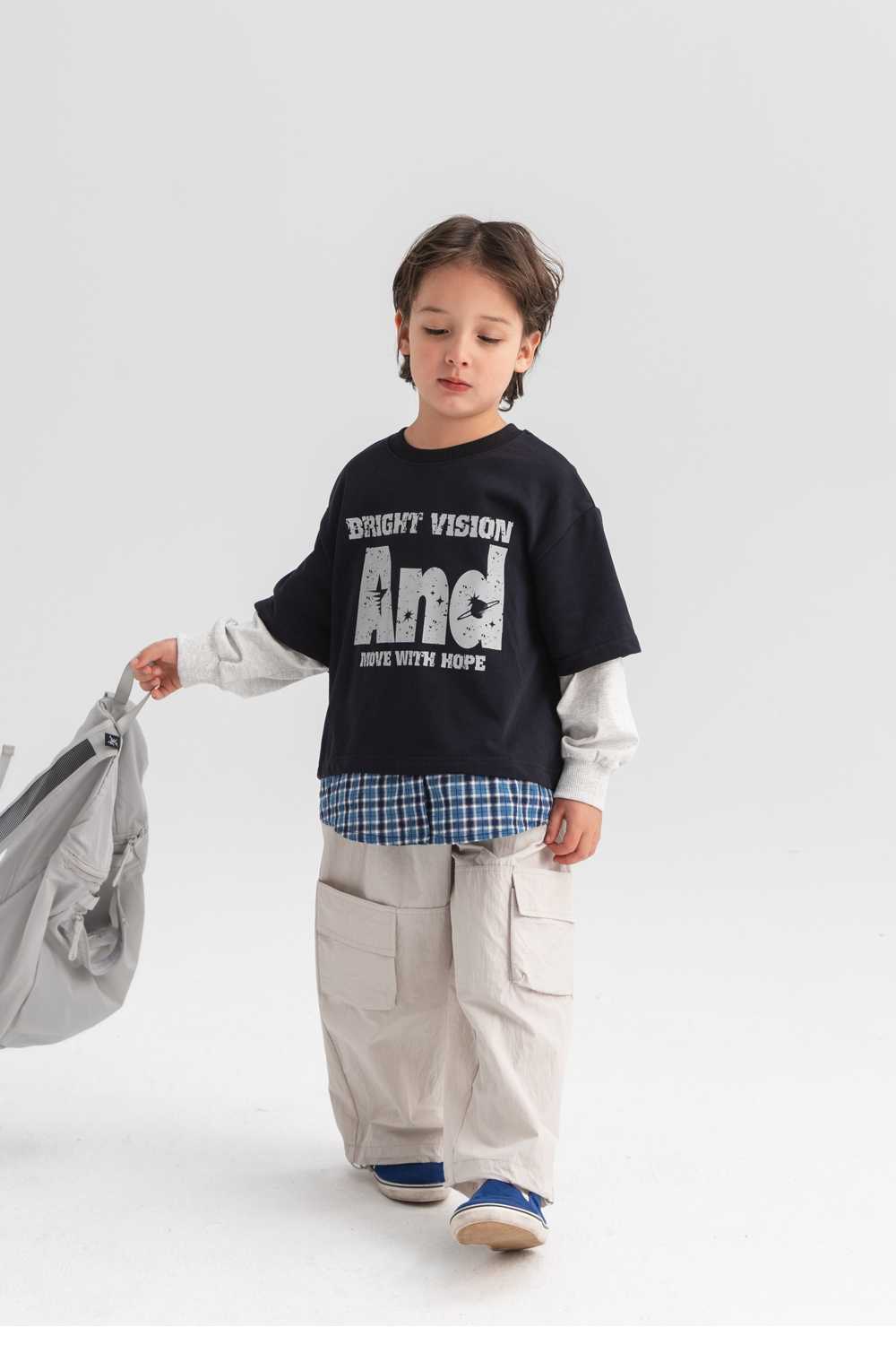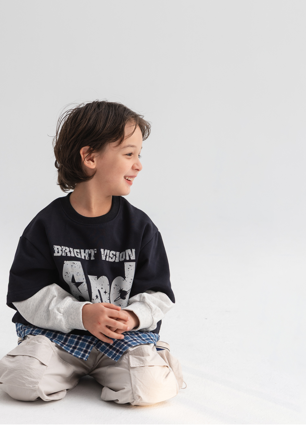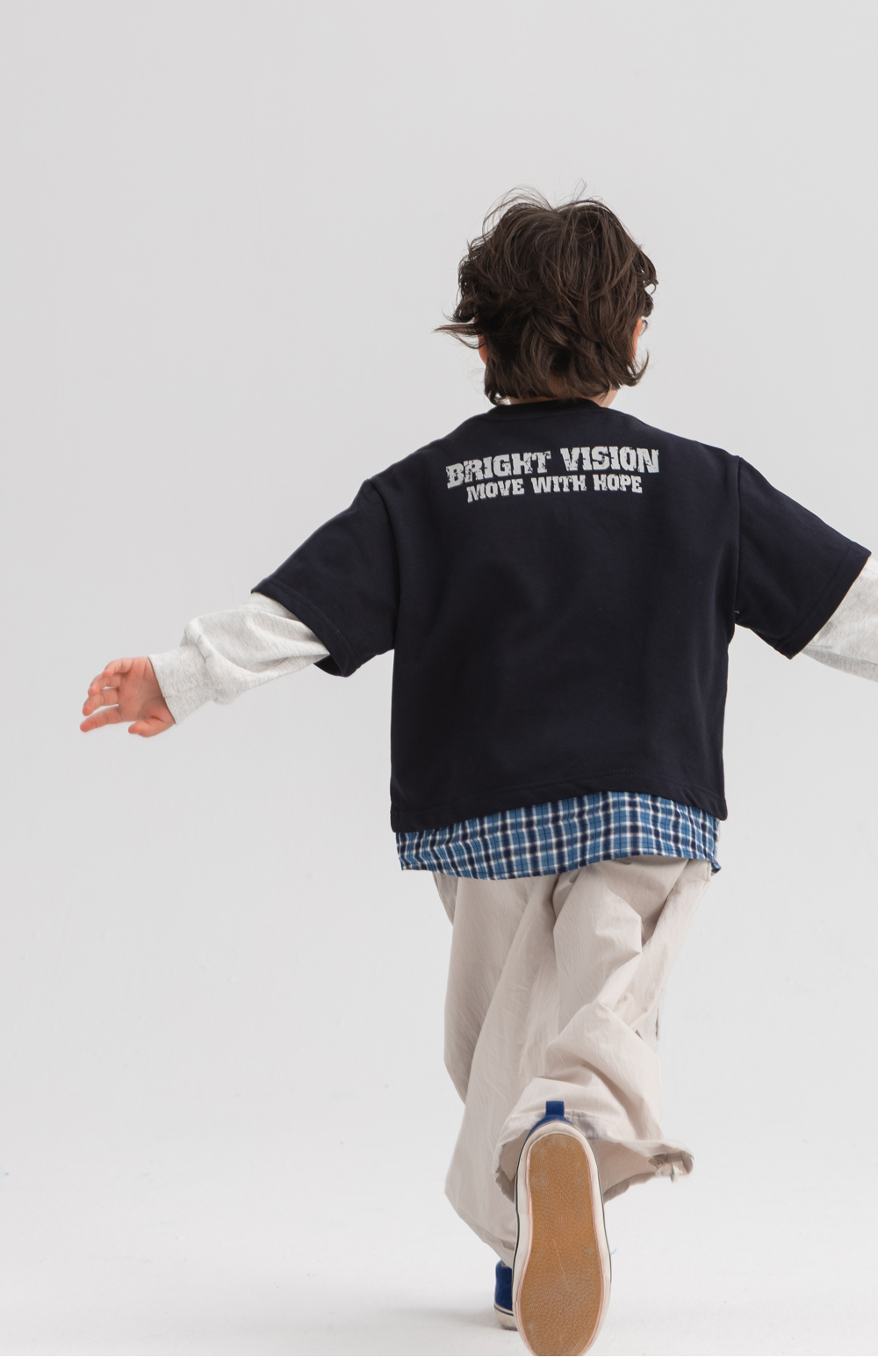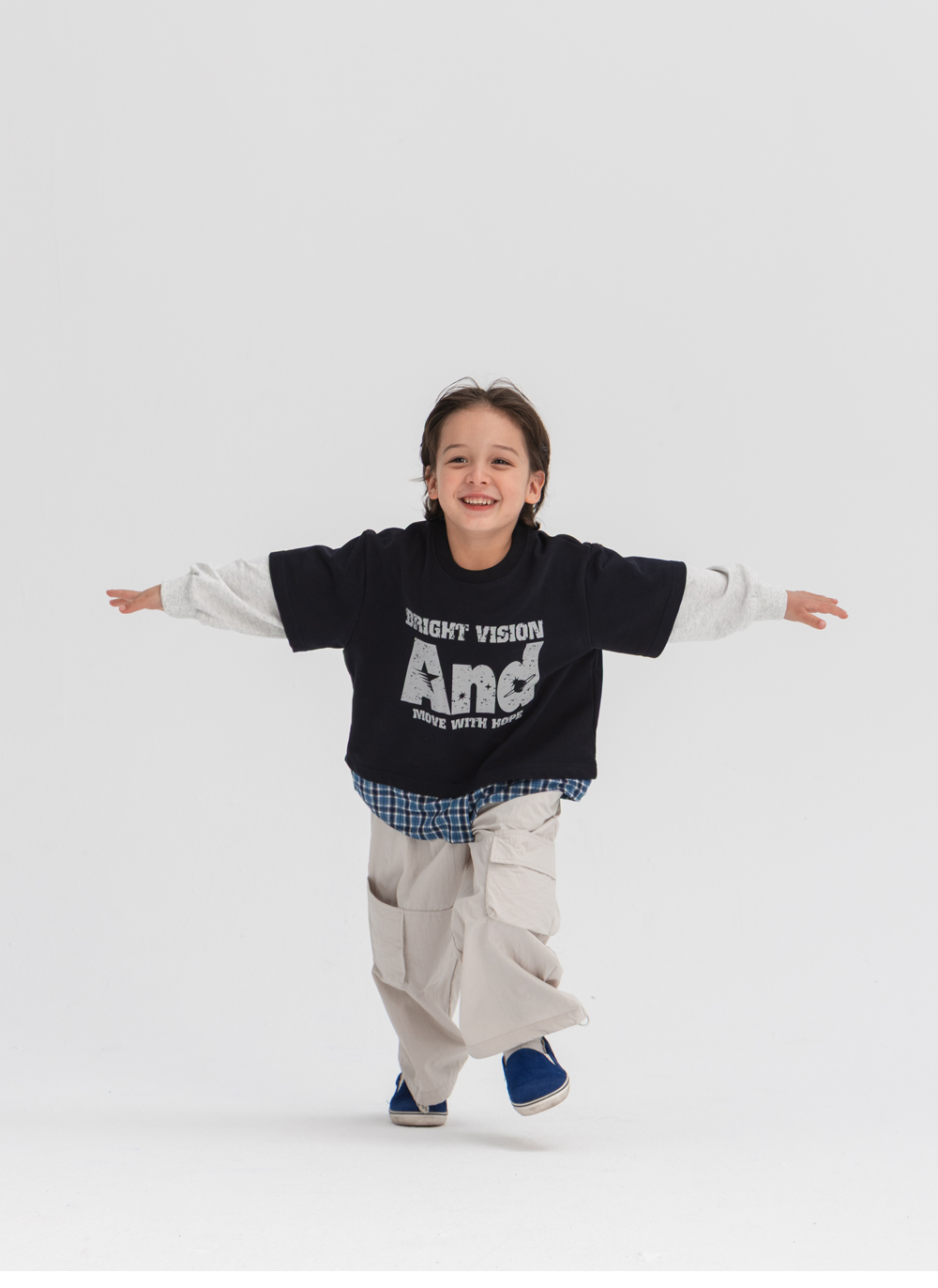 체크 셔츠와 반팔 티를 함께 매치한 듯한 디테일로,