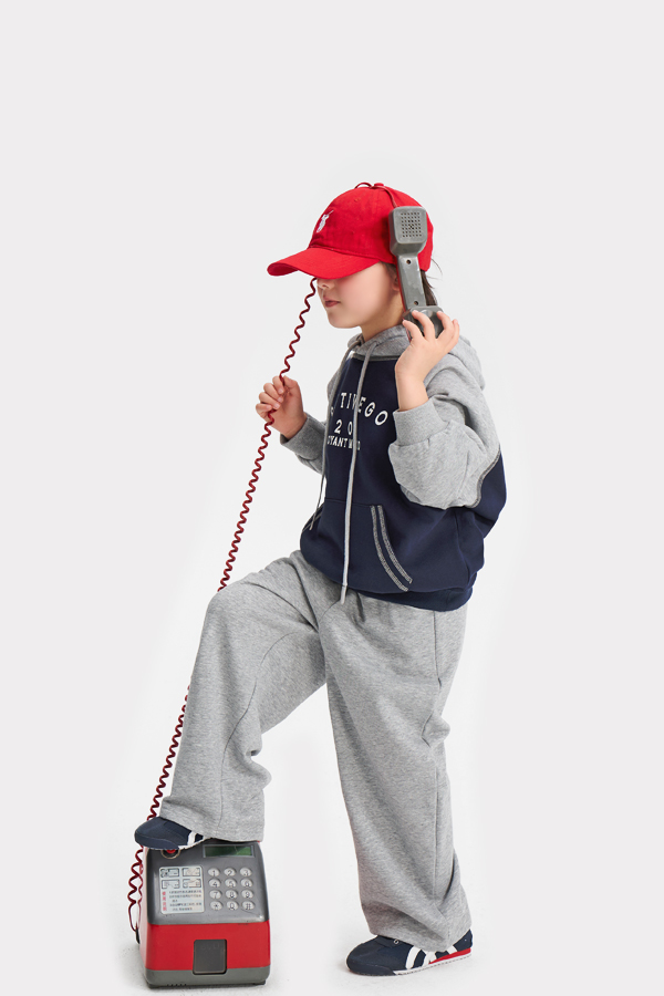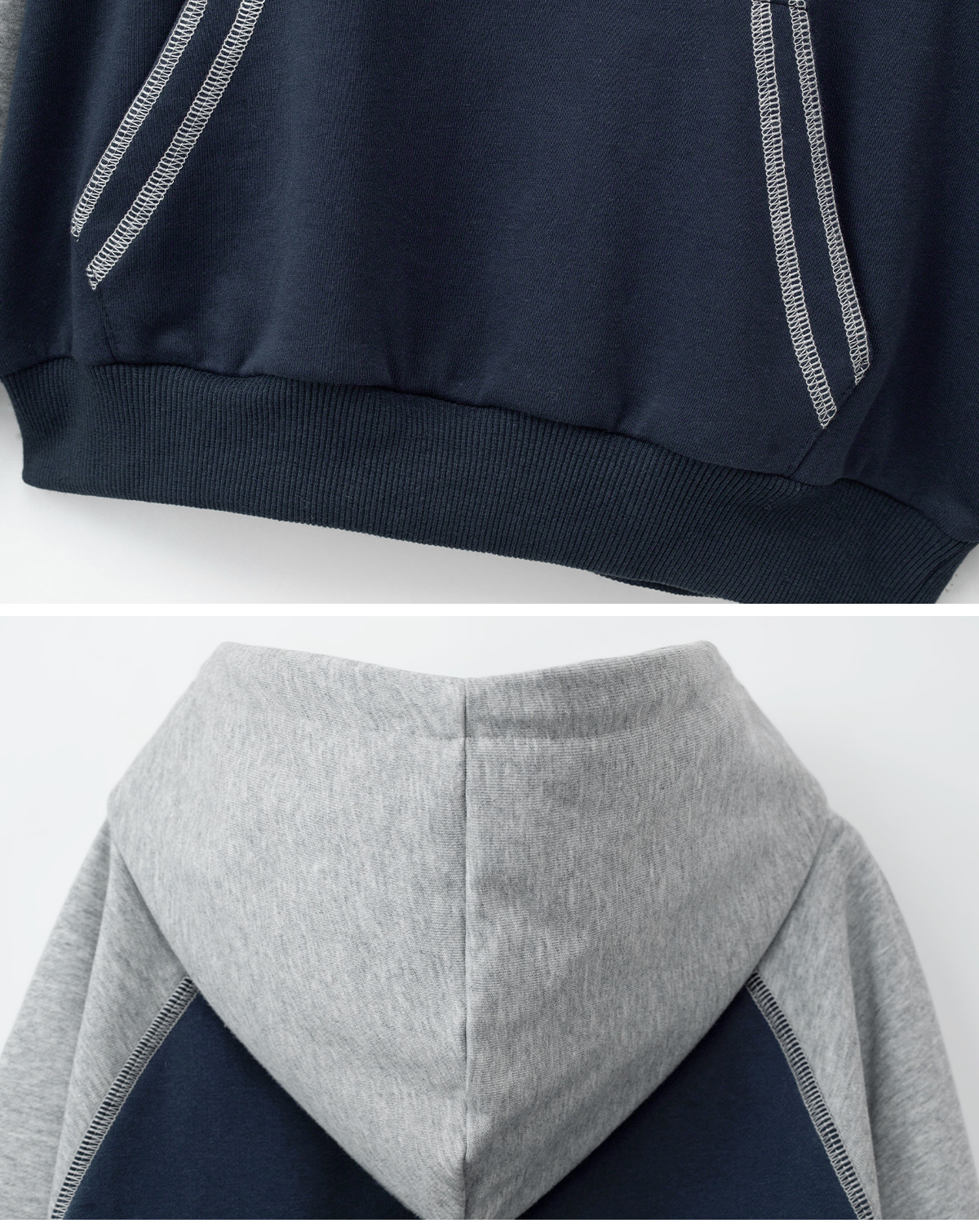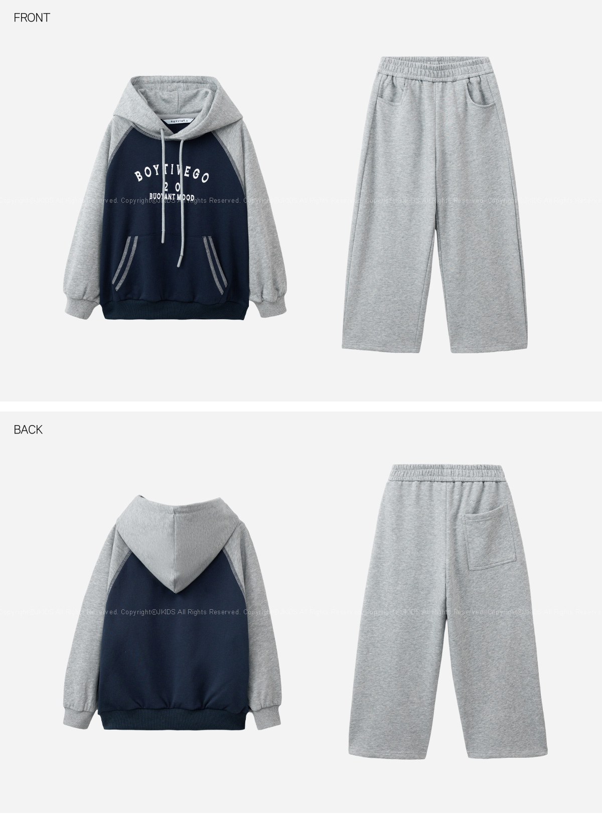 두 가지 톤의 배색이 조화로운 후드 상하 세트입니다.