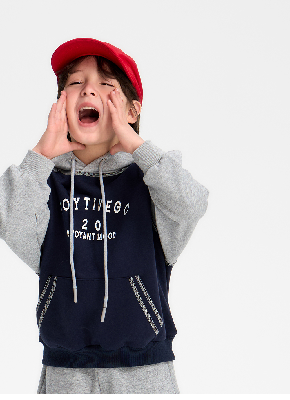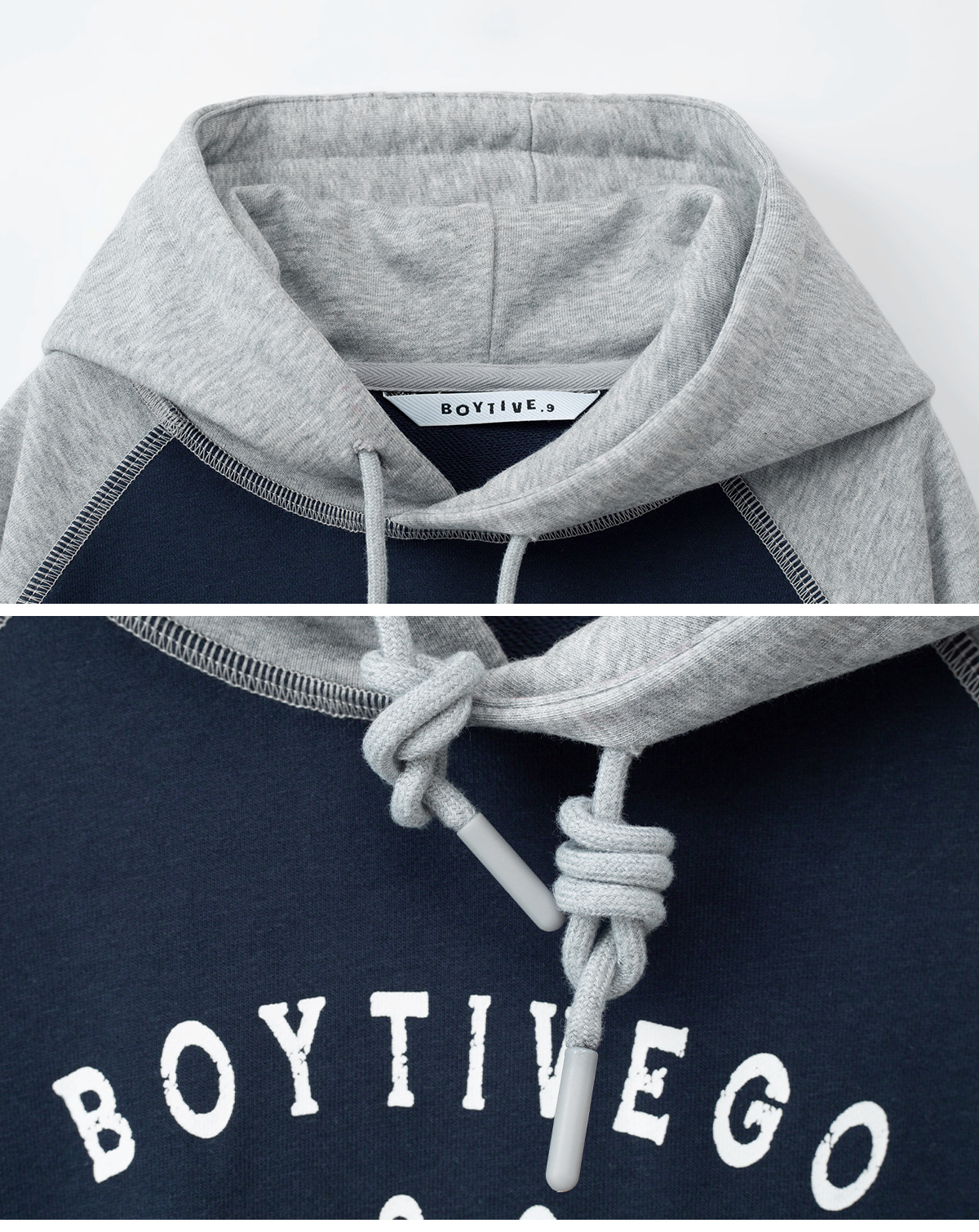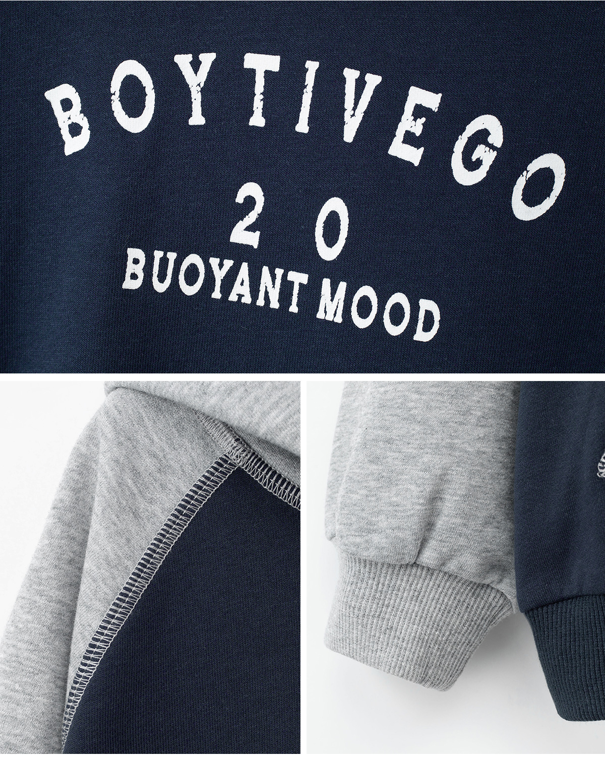 두 가지 톤의 배색이 조화로운 후드 상하 세트입니다.