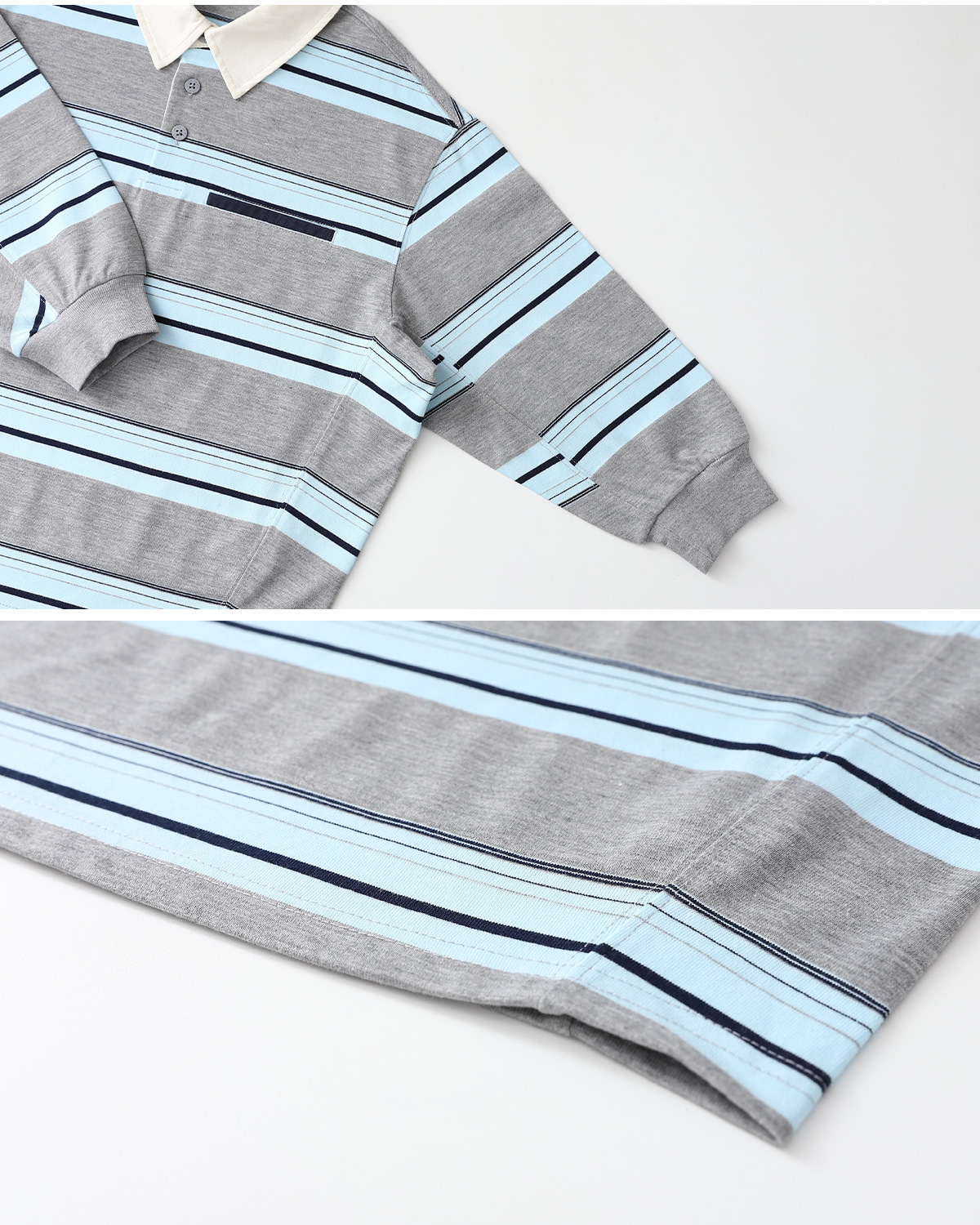 다양한 컬러의 스트라이프 패턴이 경쾌한 분위기를 더하는 티셔츠입니다.