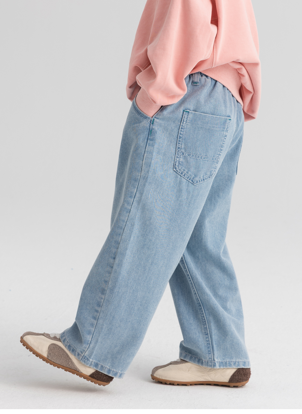 백포켓 디테일이 실용성과 함께 경쾌한 무드를 더해줍니다.