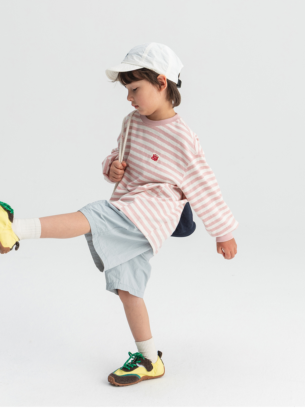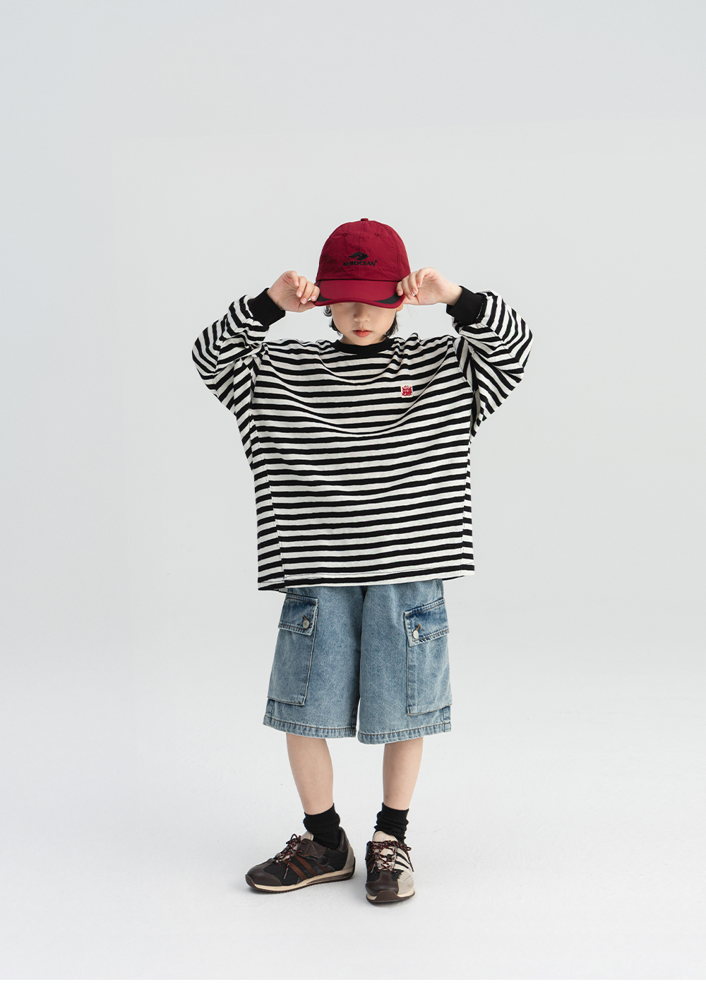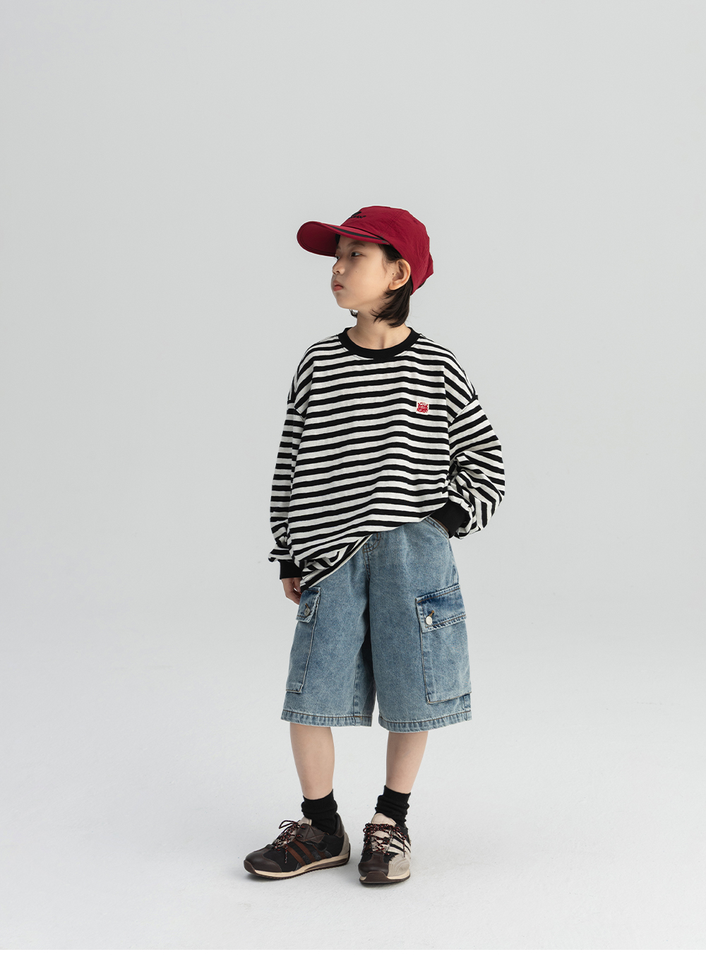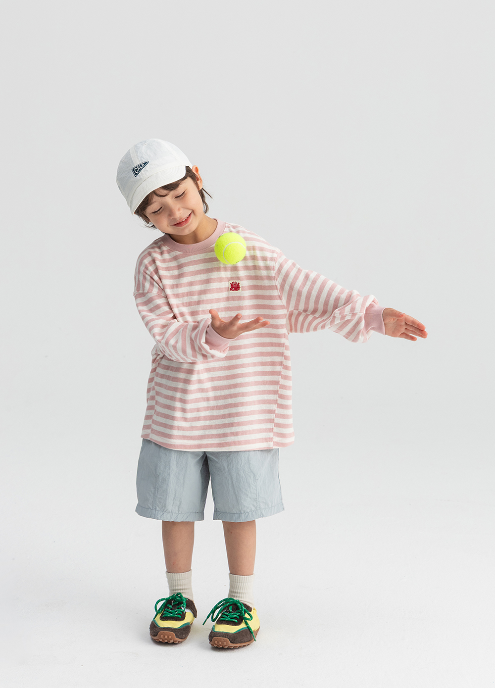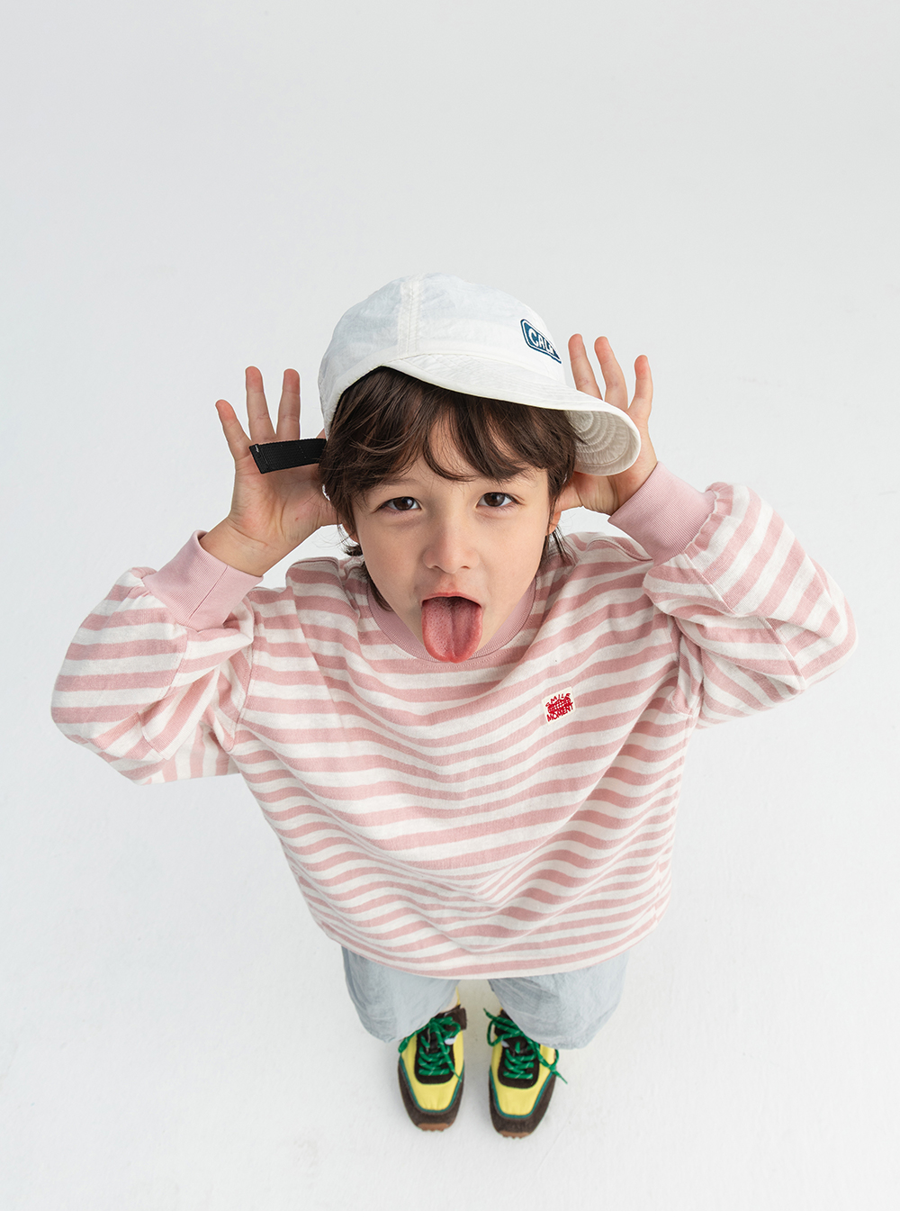 잔잔한 스트라이프에 작은 패치 포인트를 더한 티셔츠예요.