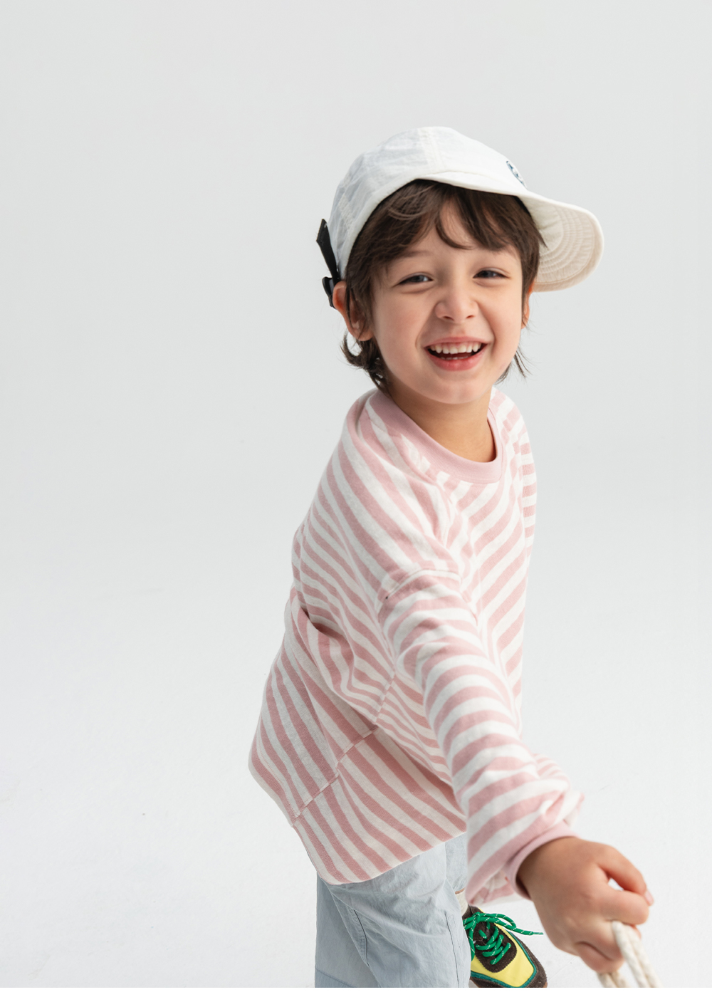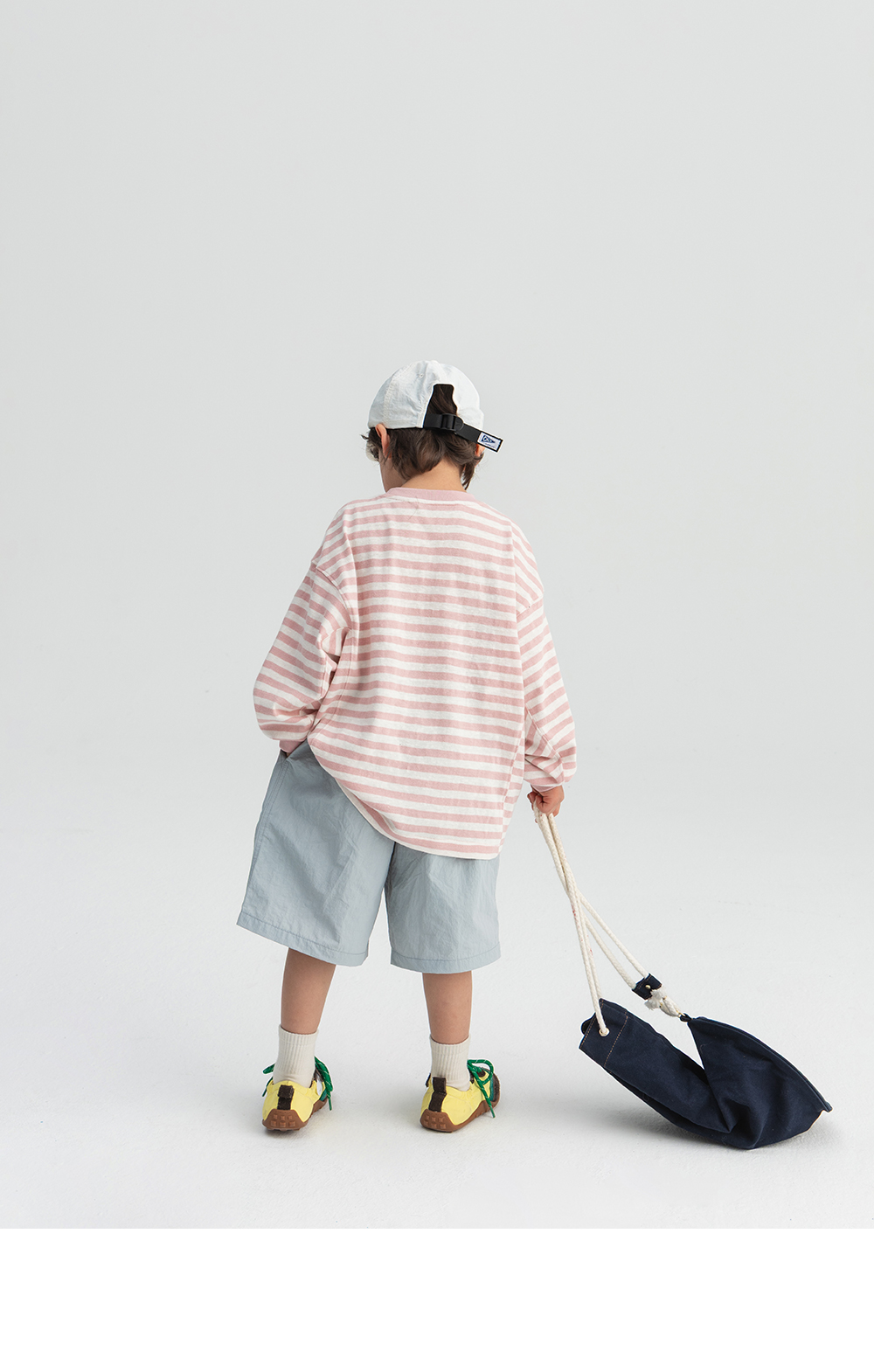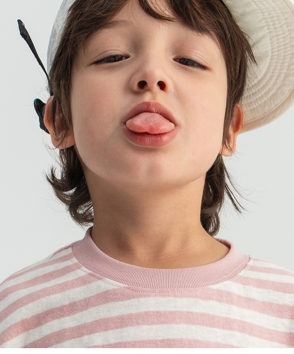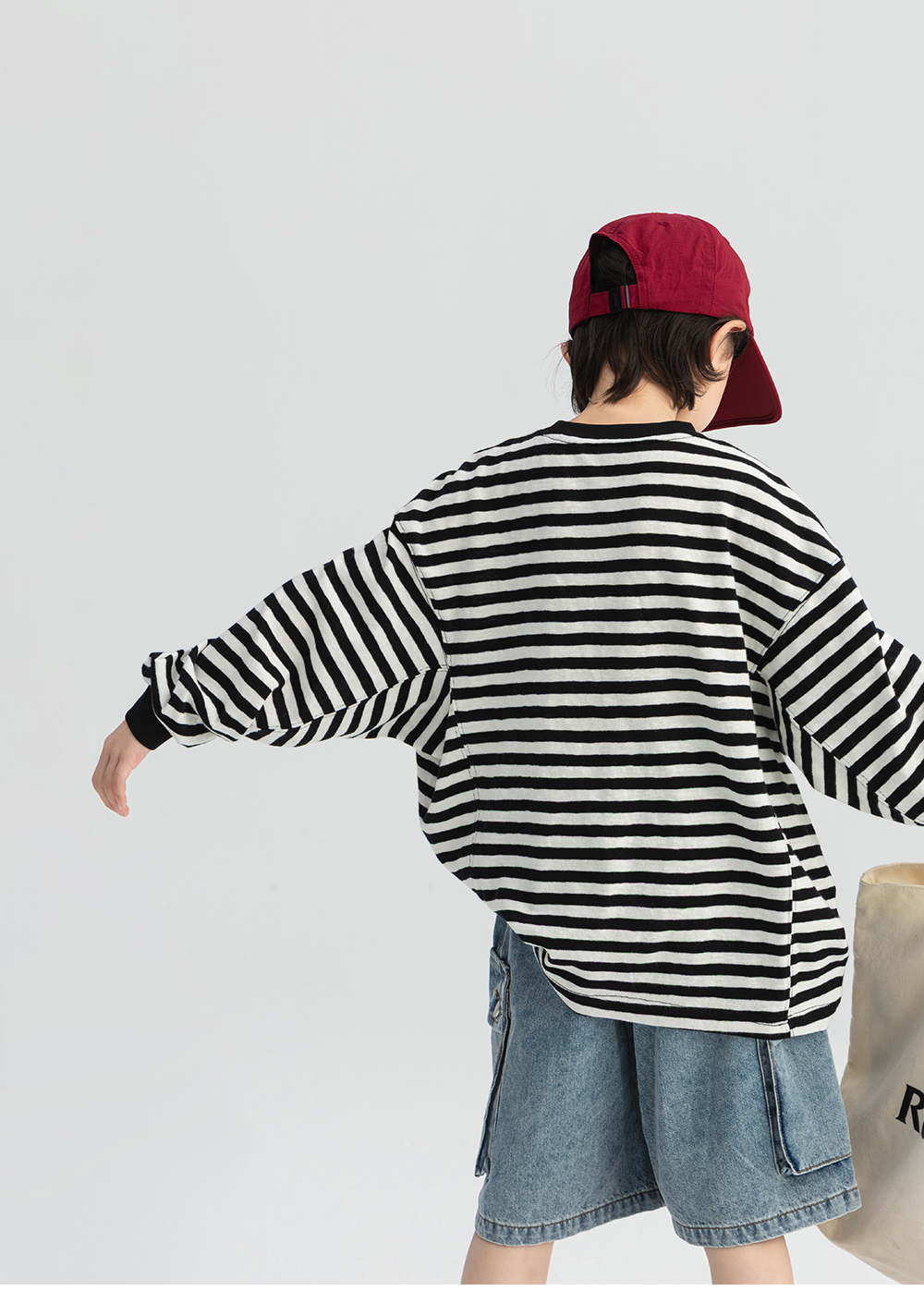 잔잔한 스트라이프에 작은 패치 포인트를 더한 티셔츠예요.