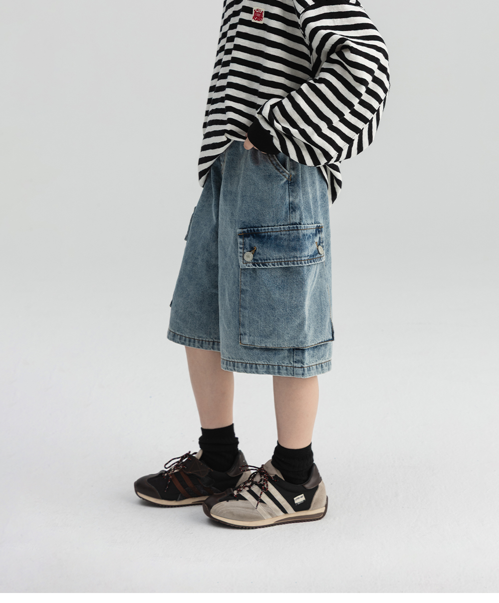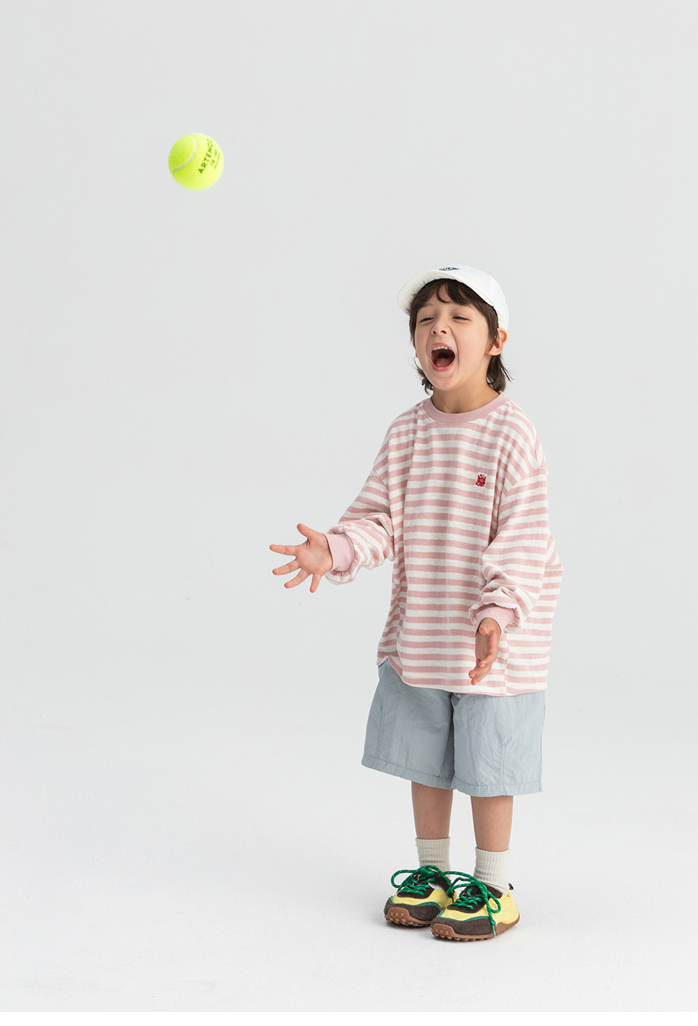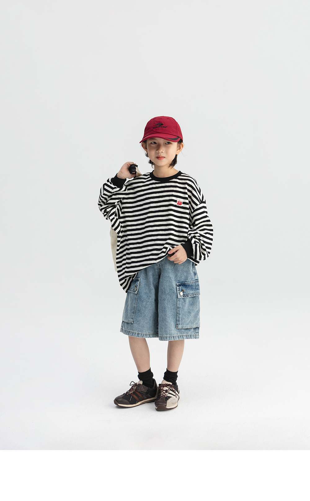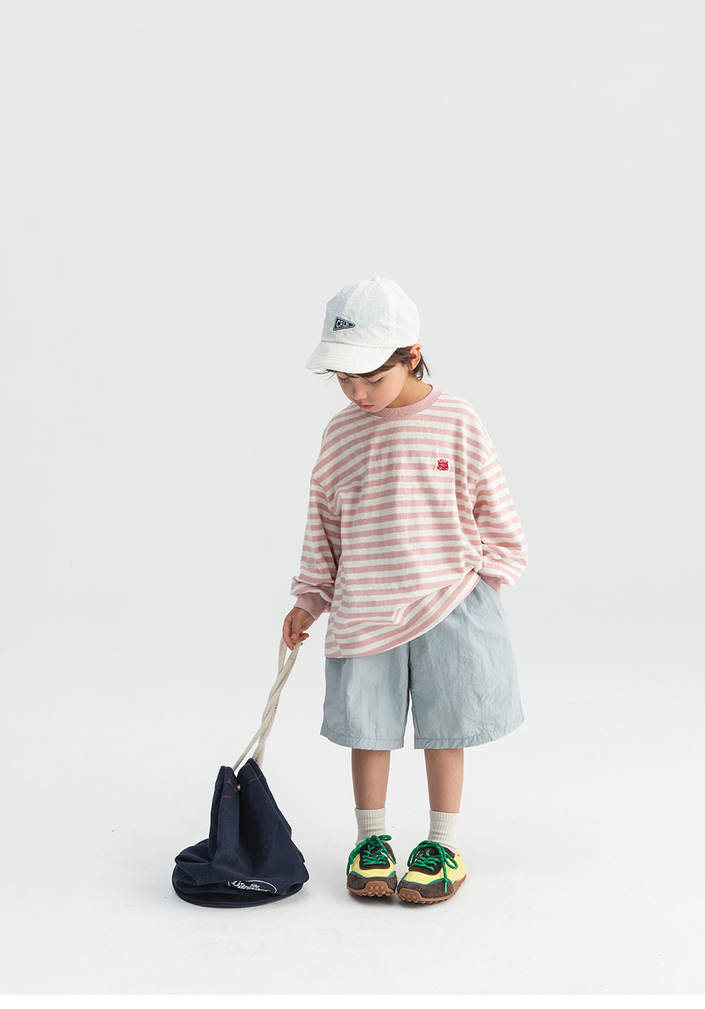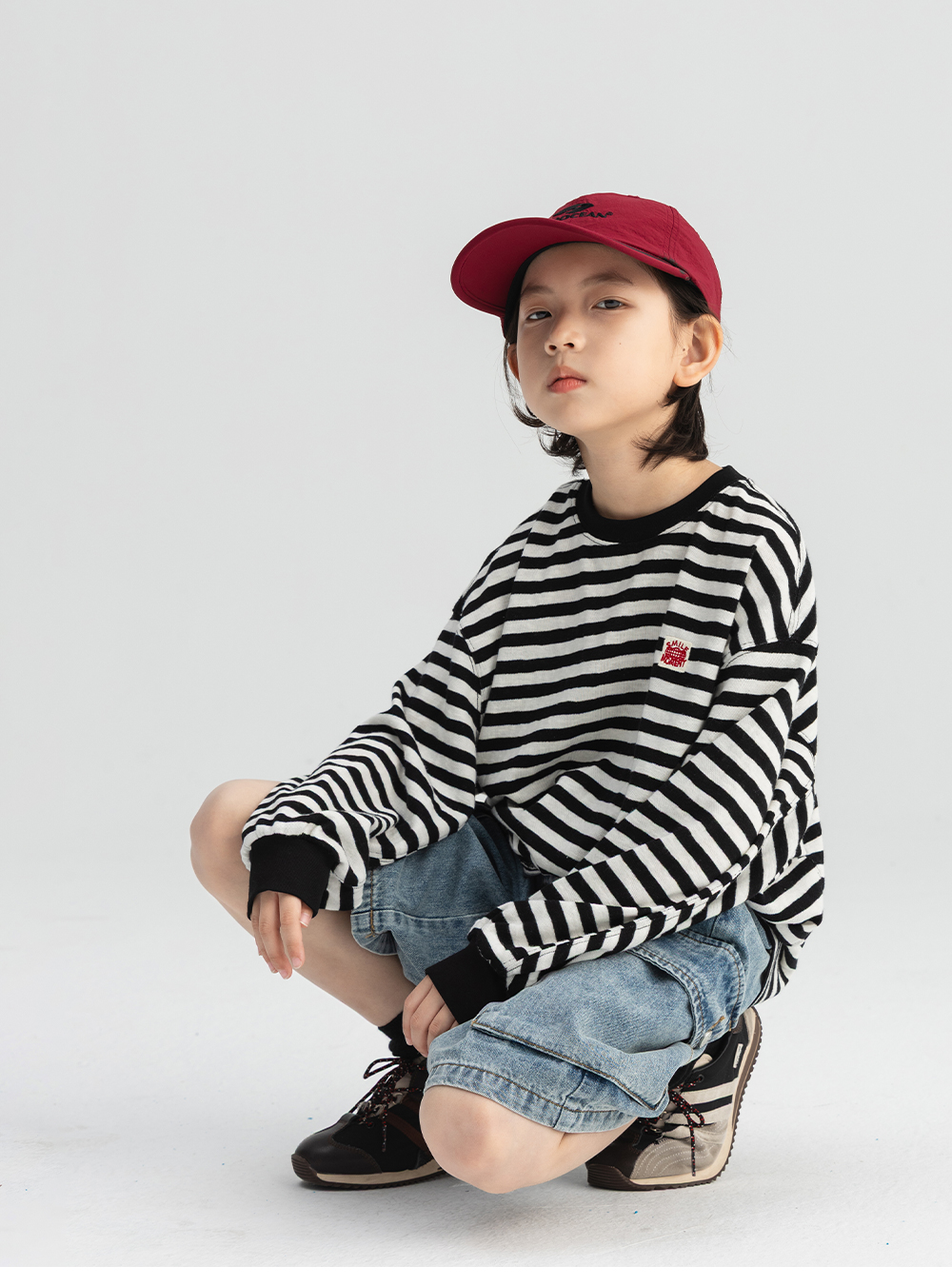 잔잔한 스트라이프에 작은 패치 포인트를 더한 티셔츠예요.