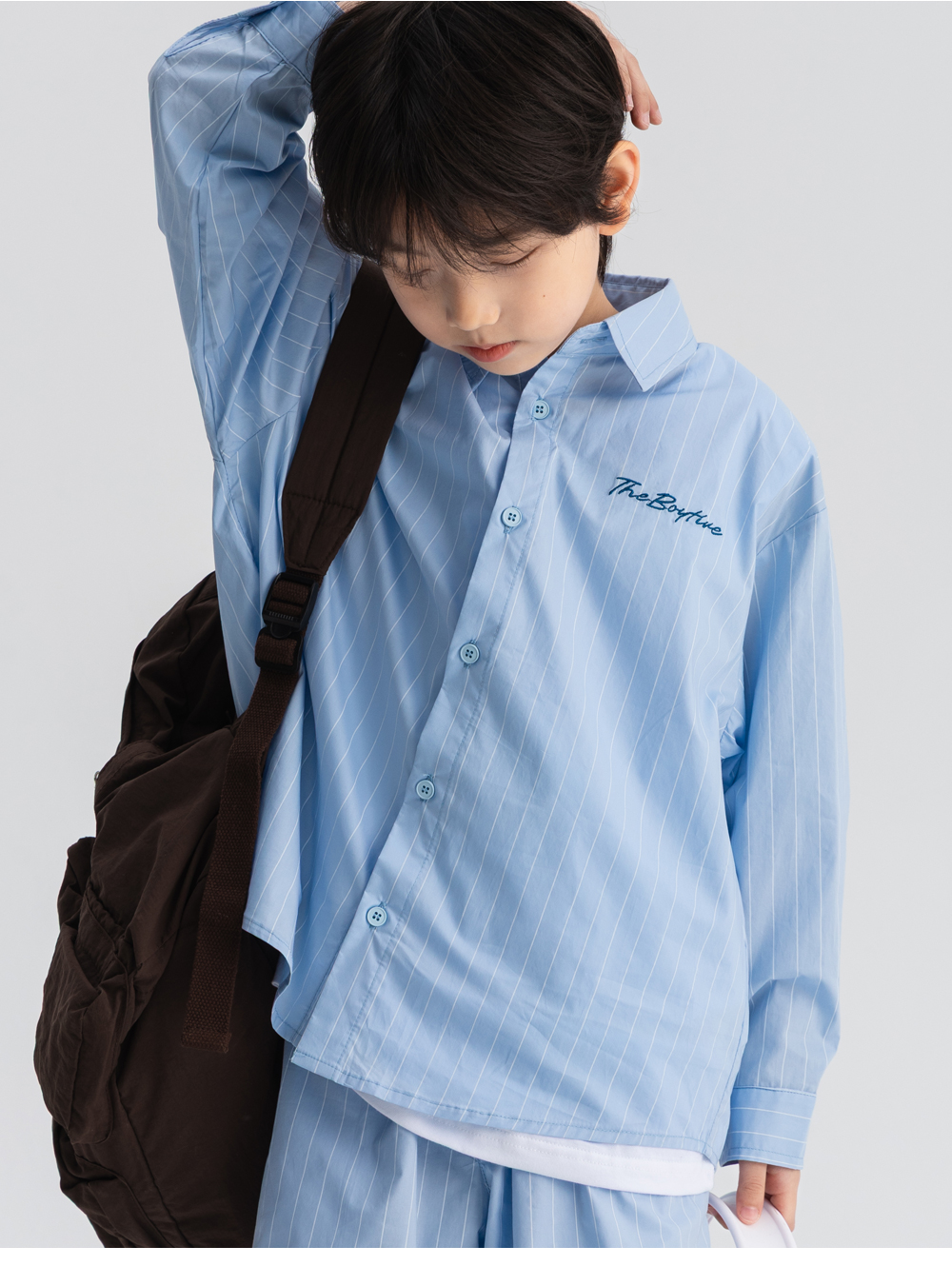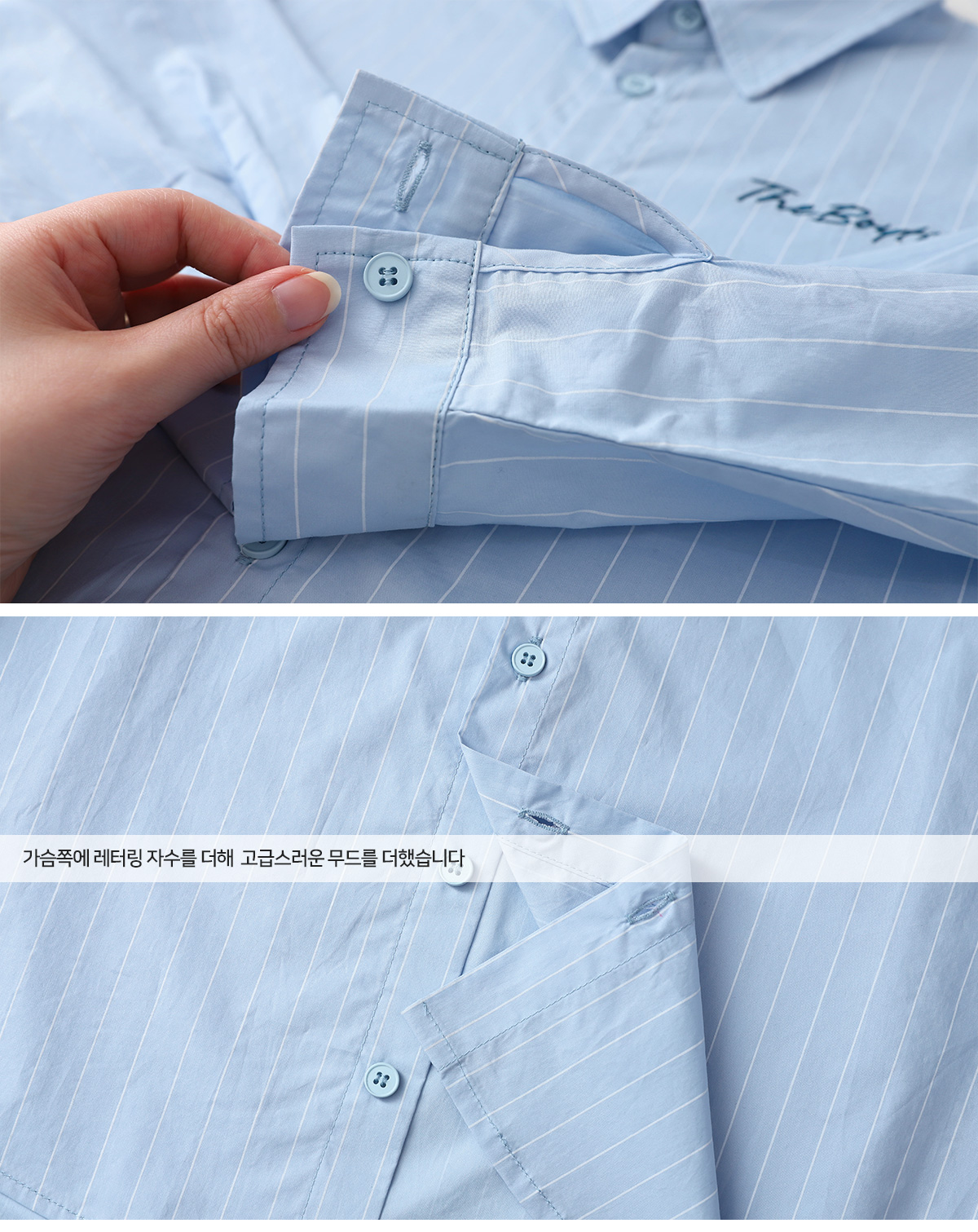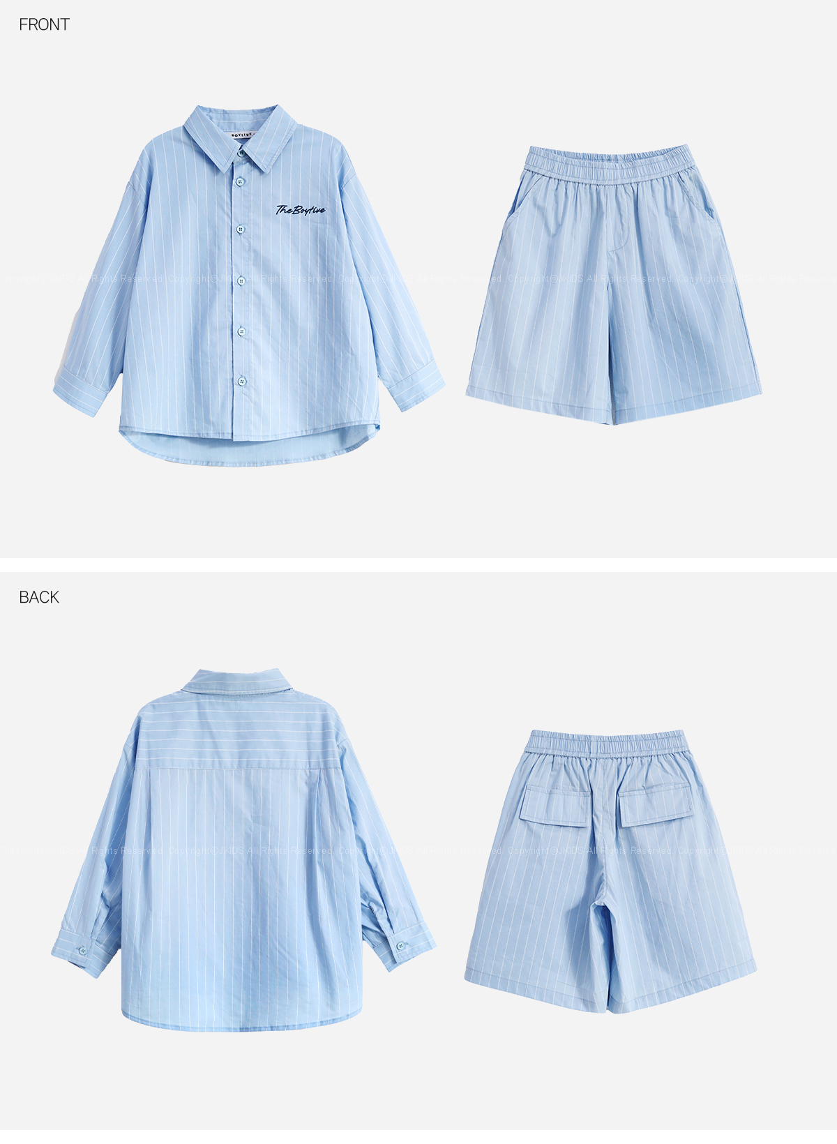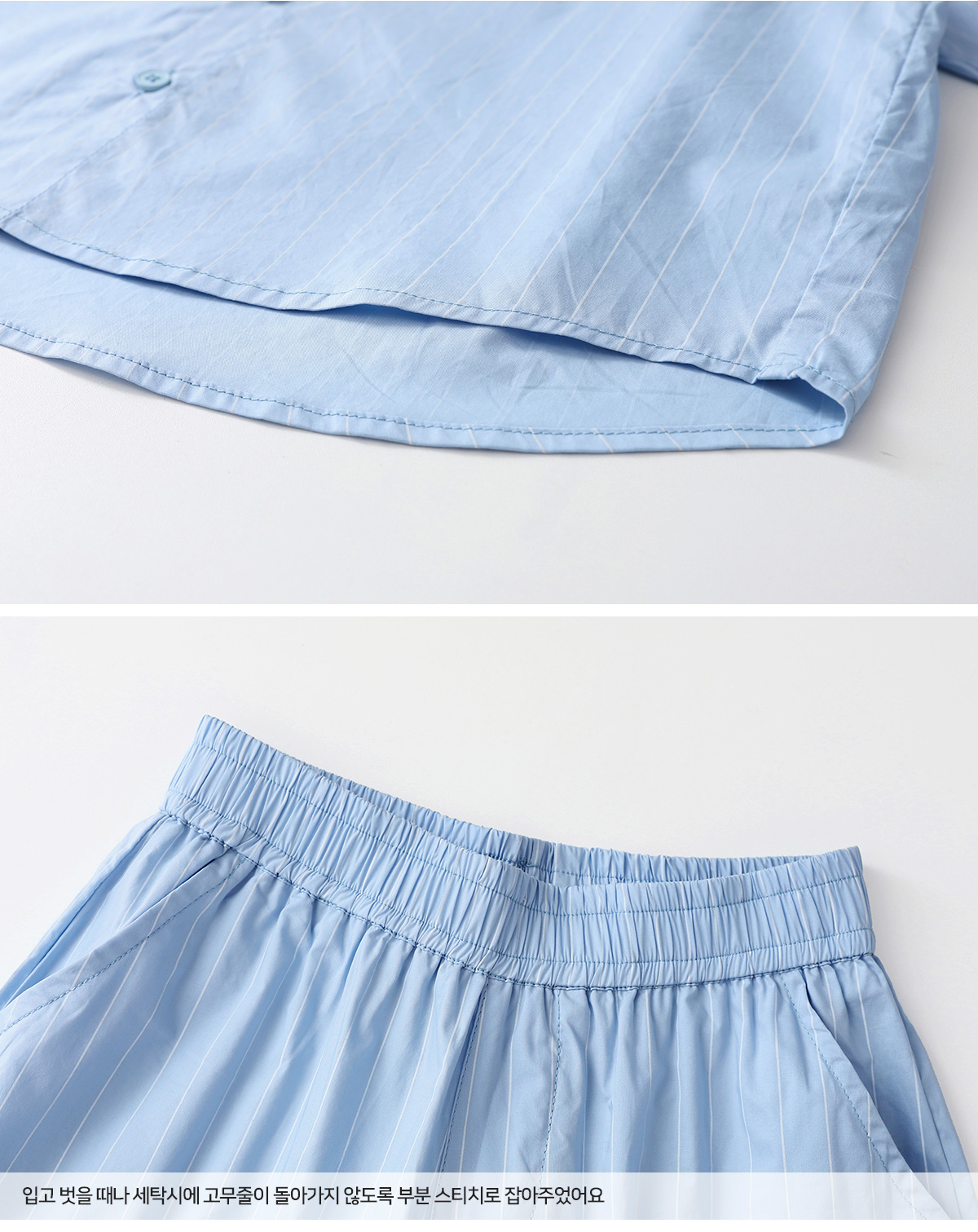 가느다란 스트라이프 결이 더해진 셔츠 세트입니다.
