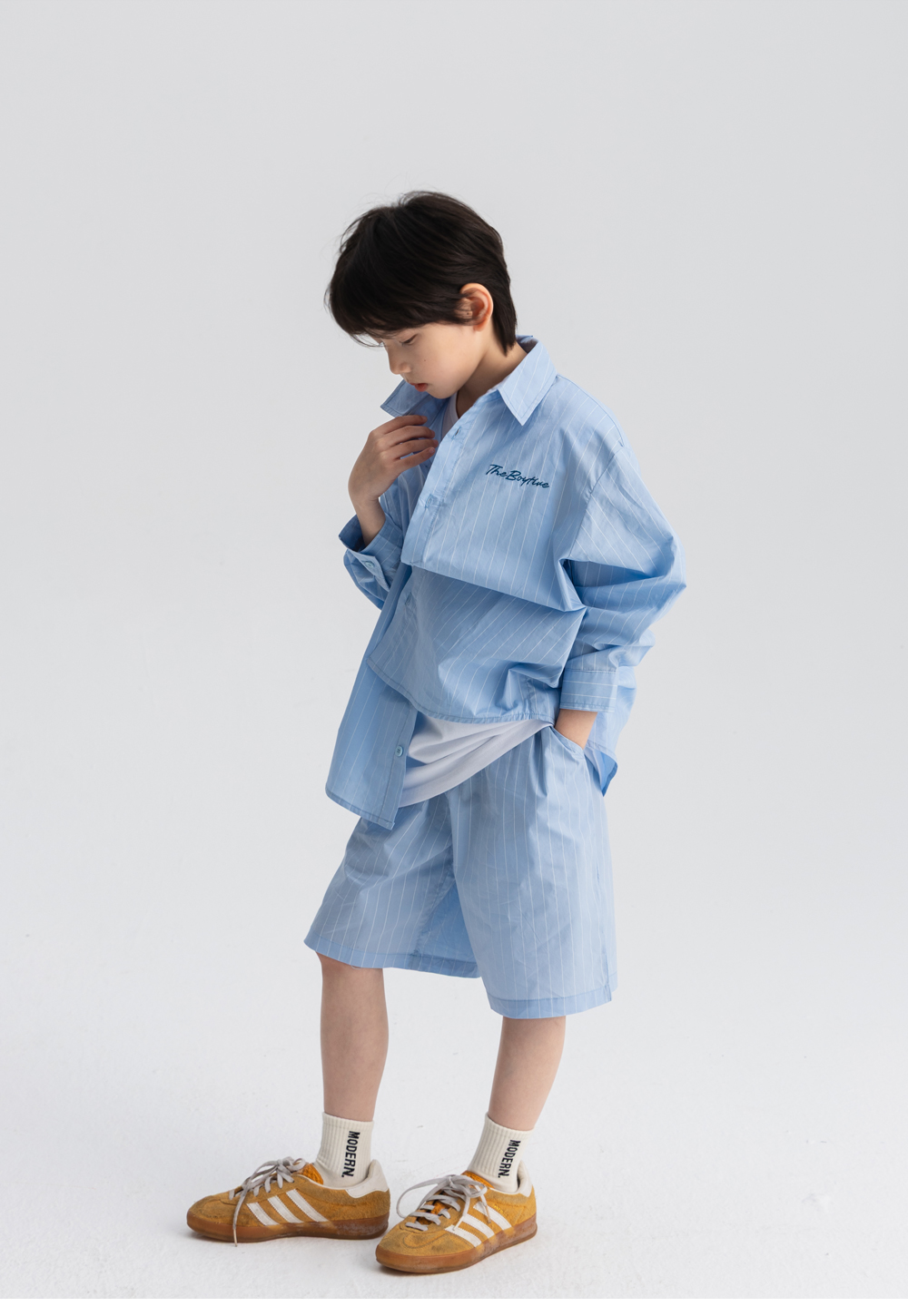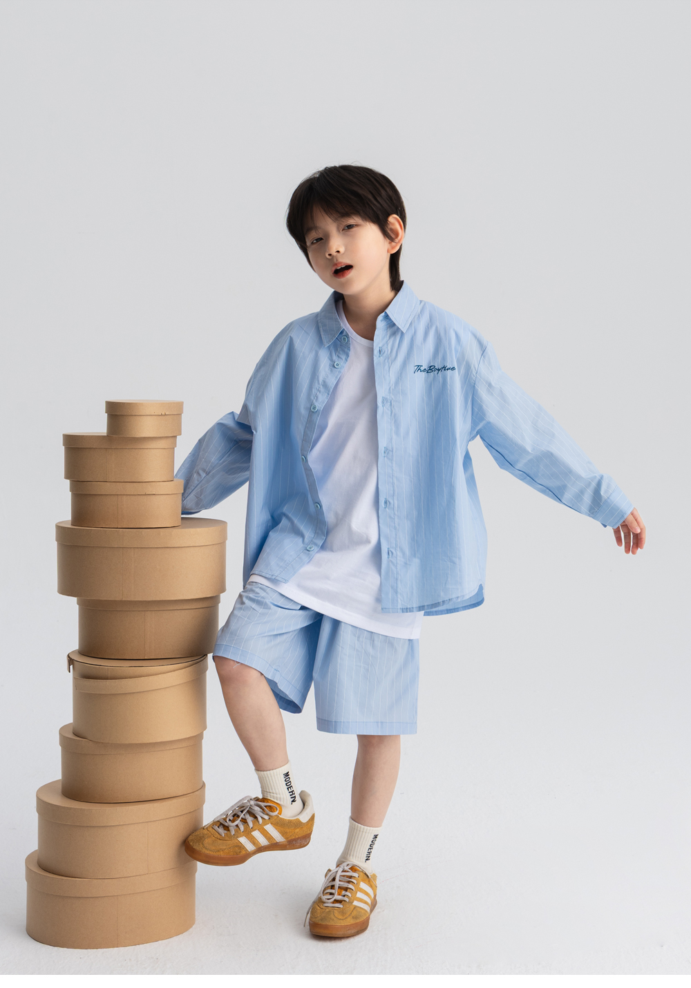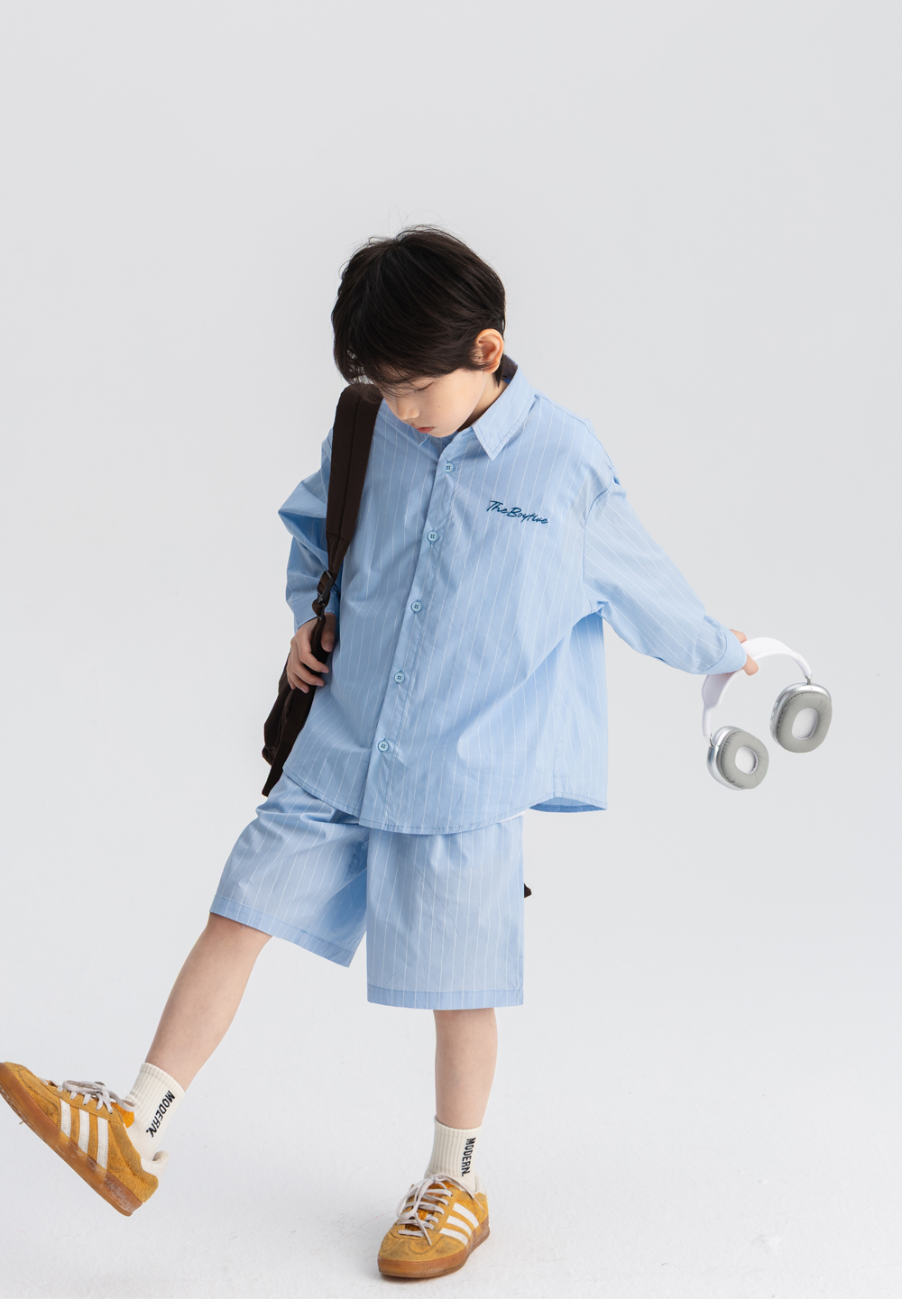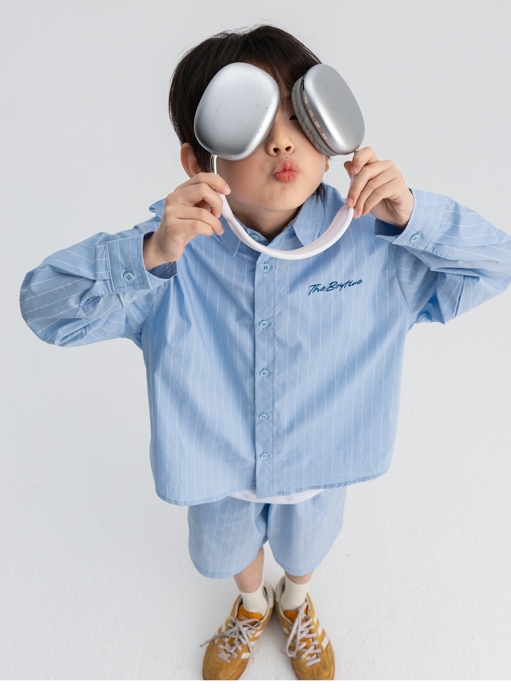 가느다란 스트라이프 결이 더해진 셔츠 세트입니다.
